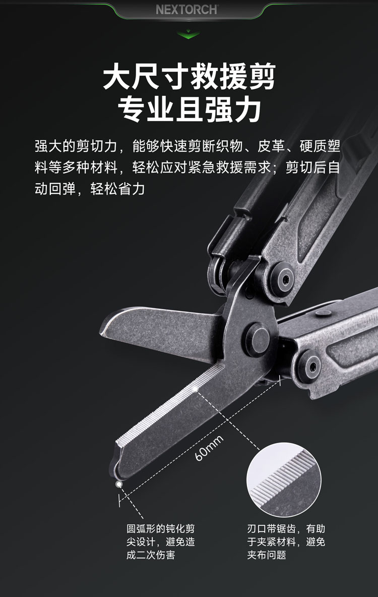 纳家专利的大救援剪设计,带有锯齿,有助于夹紧材料,可快速而强力地剪断织物、皮革、硬质塑料等多种材料。设有圆弧形的钝化剪尖设计,救护伤者时避免造成二次伤害。