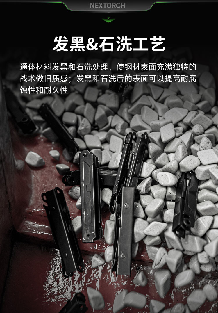 通体材料发黑和石洗处理,提高产品的耐腐蚀性和耐久性,也使钢材表面充满独特的战术做旧质感。